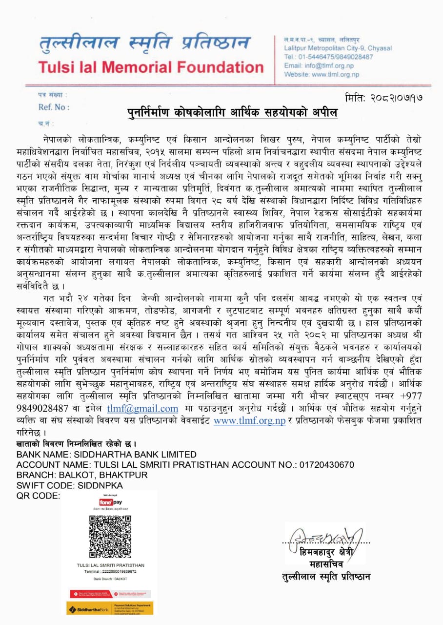 Tulsi Lal Memorial Foundation (TLMF), a non-profit making organization, registered with Nepal government and Social Welfare Council of Nepal, was established in July 1998 in the memory of late Comrade Tulsi Lal Amatya, a veteran communist stalwart, who struggled, sacrificed and devoted his life for the cause of Communist, Democratic and Peasant movement in Nepal. Establishment of the foundation after his name by his comrade-in-arms and followers can be considered as the first step in a right direction to uphold the principles cherished by him for the establishment of just, equitable, exploitation free and democratic society in Nepal.